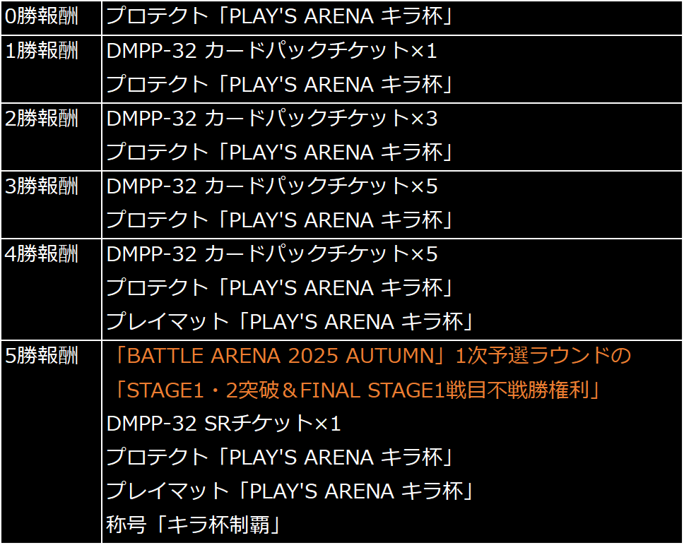 例)今回のイベントと公認大会で権利を1回ずつ獲得した場合、「BATTLE ARENA 2025 AUTUMN」1次予選ラウンドにて、STAGE1・2突破&FINAL STAGEで2勝した状態からスタートとなります。