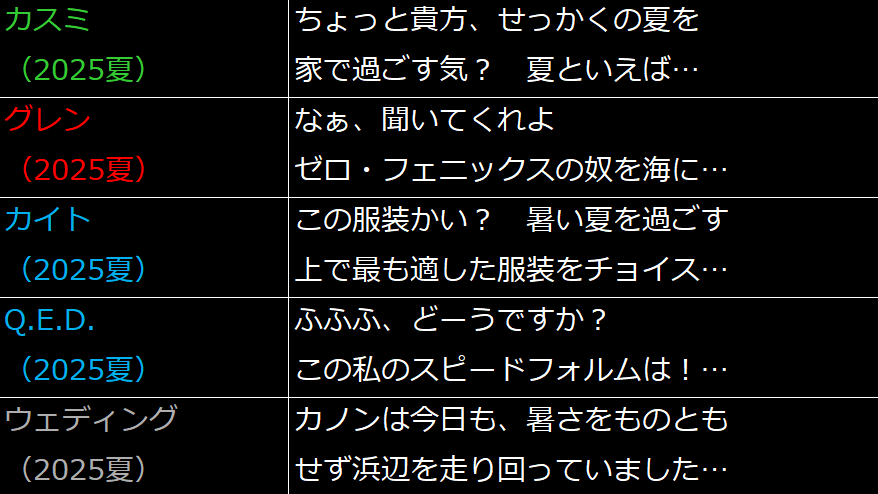 スキンチップを4個集めることで交換できるスキン(カスミ(2025夏)、グレン(2025夏)、カイト(2025夏)、Q.E.D.(2025夏)、ウェディング(2025夏))をアバターに設定してデュエルを行うと、S・トリガー発動時に専用のカットインが表示されます。