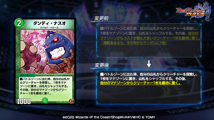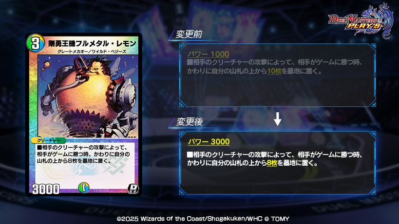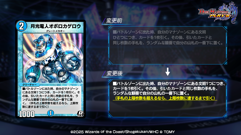 これからも皆様により良いゲームバランスをご提供し続けるべく、対戦データの集計と分析を今後も実施してまいります。ゲームバランスを調整する為、必要に応じてカード能力変更などの対応を行う場合がございます。下方修正となる場合は、当該カードを分解した時に獲得できるDMポイントの数値変更やアイテムの配布によって補償いたします。皆様に楽しんでいただけるゲームバランスを維持できるよう注力してまいりますので、ご理解の程よろしくお願いいたします。