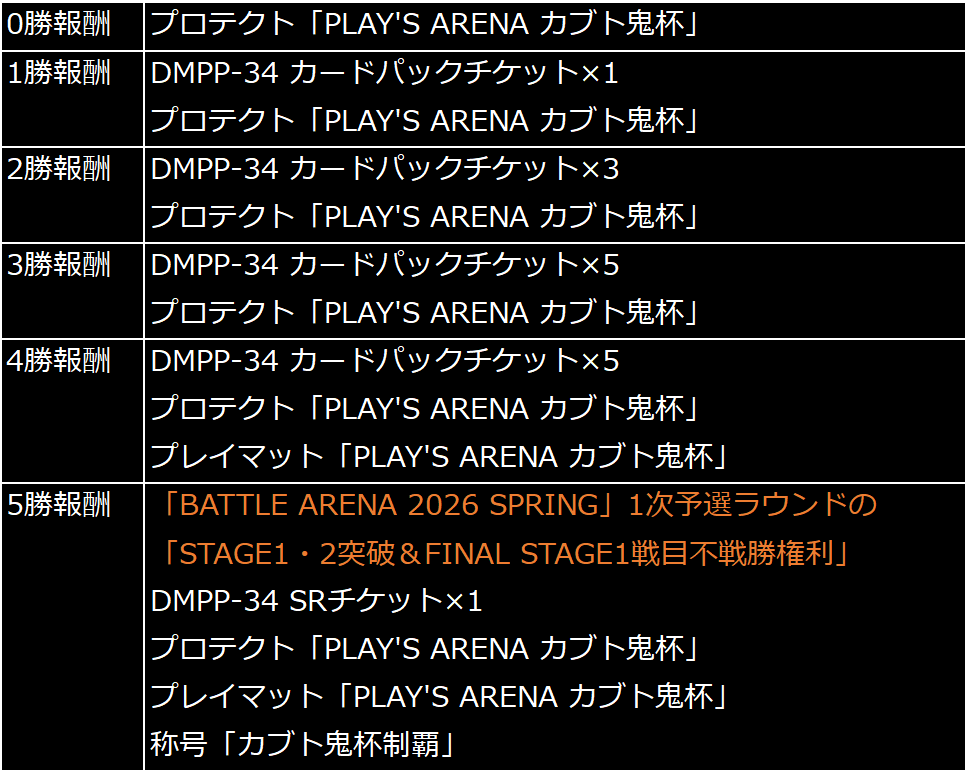 例)今回のイベントと公認大会で権利を1回ずつ獲得した場合、「BATTLE ARENA 2026 SPRING」1次予選ラウンドにて、STAGE1・2突破&FINAL STAGEで2勝した状態からスタートとなります。