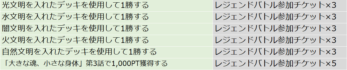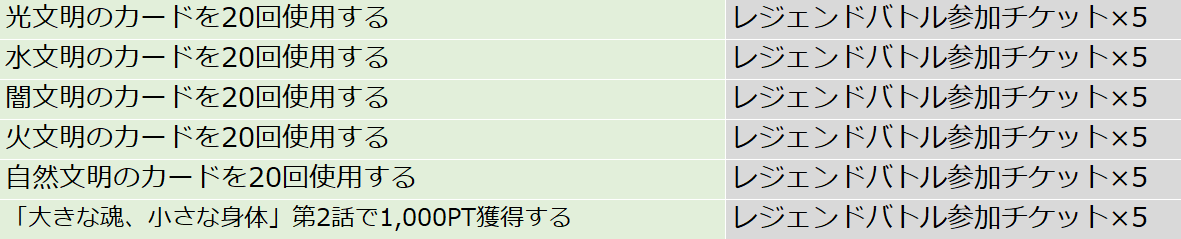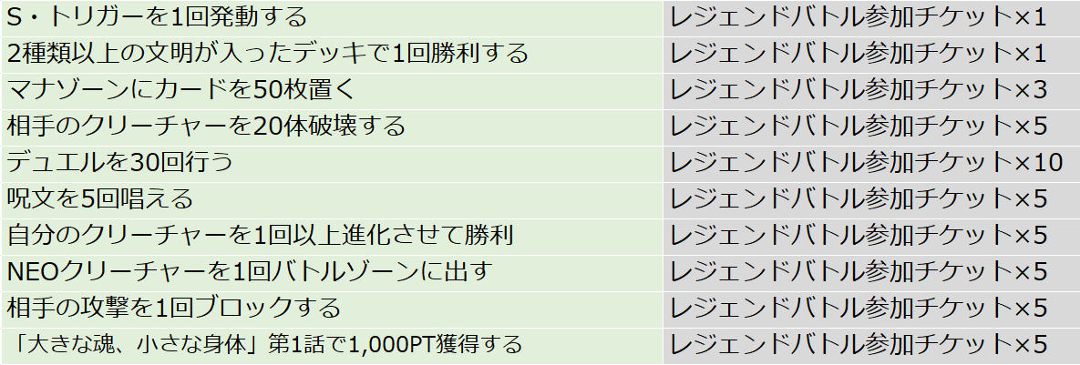 デュエルを行うことでレジェンドポイントが入手でき、集めたポイントに応じて様々な報酬が獲得できます。ポイントを集めて特別イラストの 《蓄積された魔力》(PR) や DMPP-34 SRチケット が入手可能!