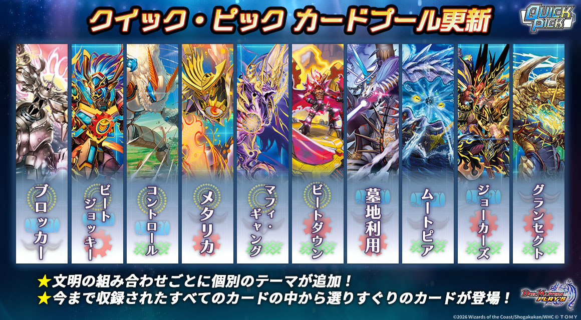 今回の提示されるカードの更新では、文明の組み合わせごとにテーマがあり、テーマに沿ったカードをピックしやすくなっております!