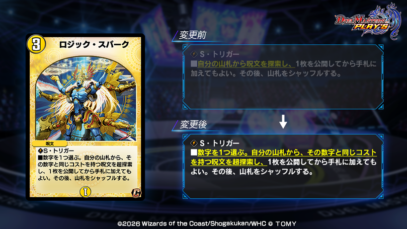 ■ 数字を1つ選ぶ。自分の山札から、その数字と同じコストを持つ呪文を超探索し 、1枚を公開してから手札に加えてもよい。その後、山札をシャッフルする。
