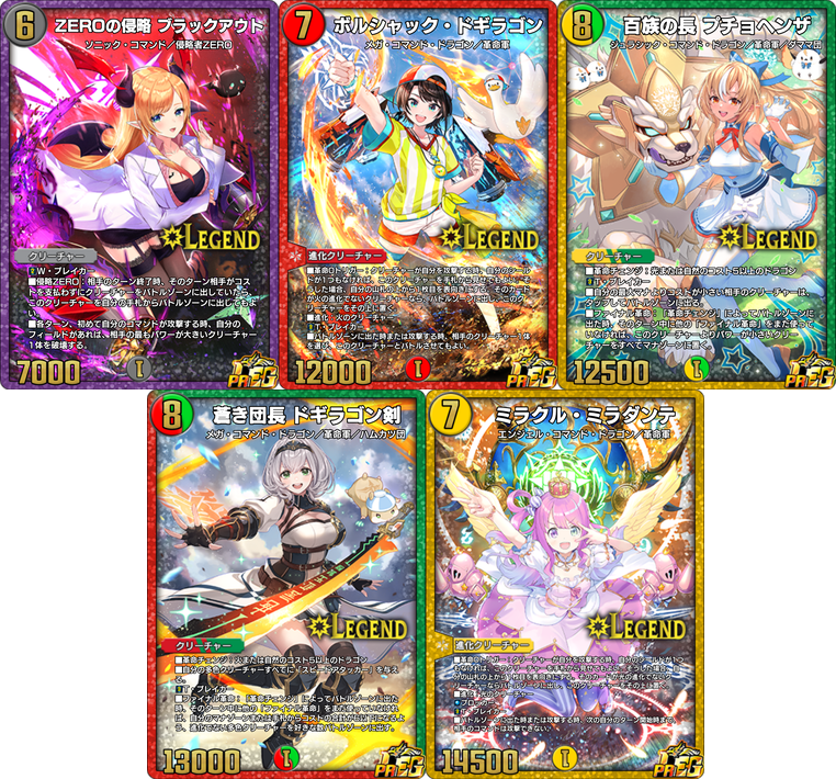 コラボ用特別イラストの 《ZEROの侵略 ブラックアウト》(PR) 、 《ボルシャック・ドギラゴン》(PR) 、 《百族の長 プチョヘンザ》(PR) 、 《蒼き団長 ドギラゴン剣》(PR) 、 《ミラクル・ミラダンテ》(PR) のいずれか1枚がランダムで獲得できます。