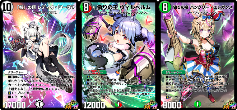 コラボ用特別イラストの 《「智」の頂 レディオ・ローゼス》(PR) 、 《偽りの王 ヴィルヘルム》(PR) 、 《偽りの名 ハングリー・エレガンス》(PR) のいずれか1枚がランダムで獲得できます。