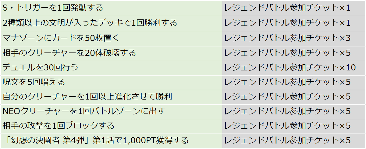 デュエルを行うことでレジェンドポイントが入手でき、集めたポイントに応じて様々な報酬が獲得できます。特別イラストの 《カラーライズ・ハーモニー》(PR) や DMPP-35 SRチケット などが入手可能!